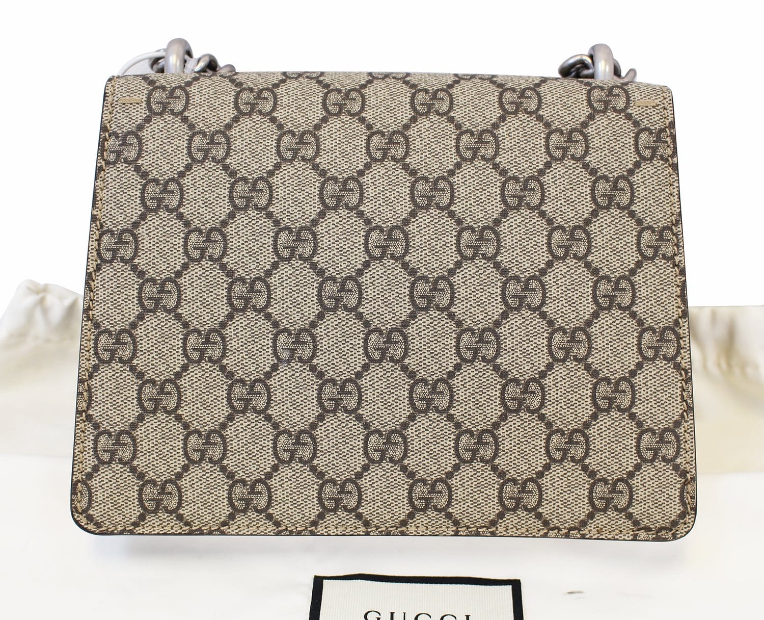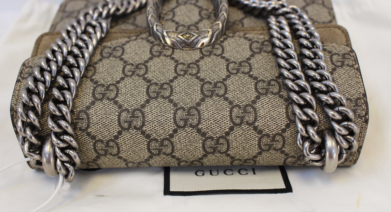 The Dionysus shoulder bag is a newer style from Gucci that has already become a classic. Featuring structured GG Supreme canvas and gorgeous taupe suede trim. The textured tiger head closure is a reference to the Greek god Dionysus. The sliding chain strap can be worn on the shoulder or carried by hand.
