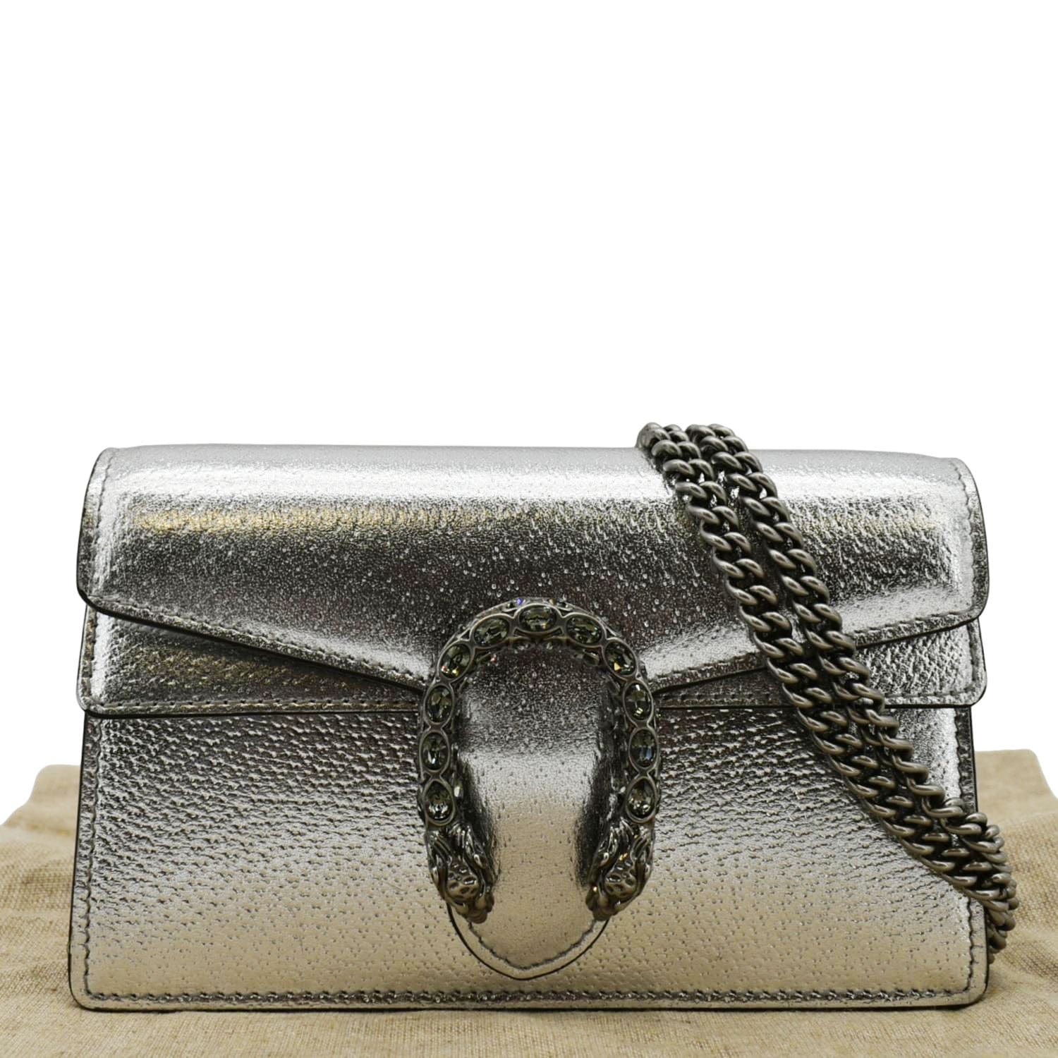 The "GUCCI Dionysus Super Mini Metallic Leather Crossbody Bag Silver" is a chic and compact accessory, featuring a gleaming metallic leather finish. Its signature tiger head closure and versatile chain strap make it perfect for both day and night.