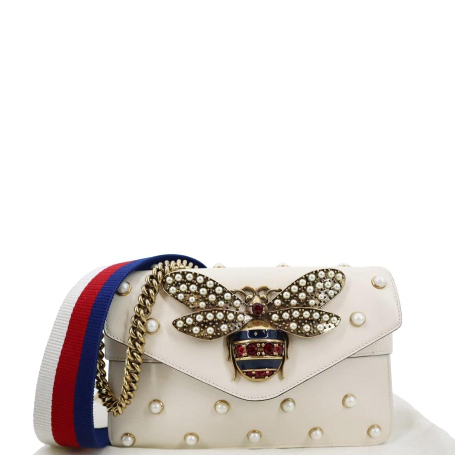 GUCCI Pearl Studded Mini Bee Broadway Leather Shoulder Bag White