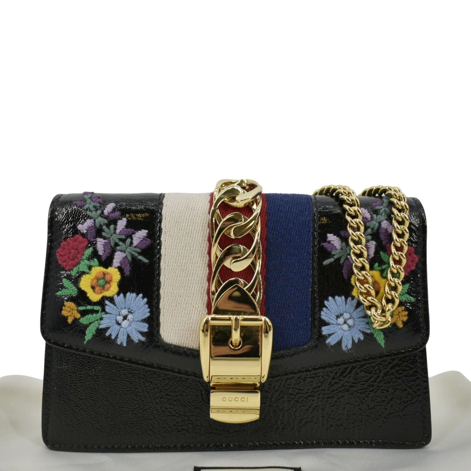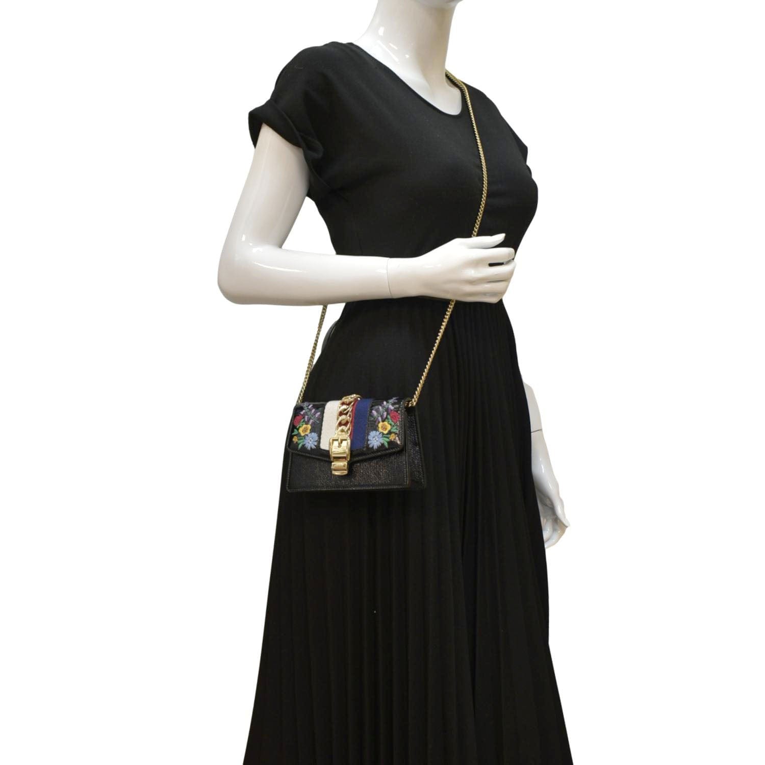 GUCCI Sylvie Super Mini Embroidered Leather Crossbody Chain Wallet Black 494646