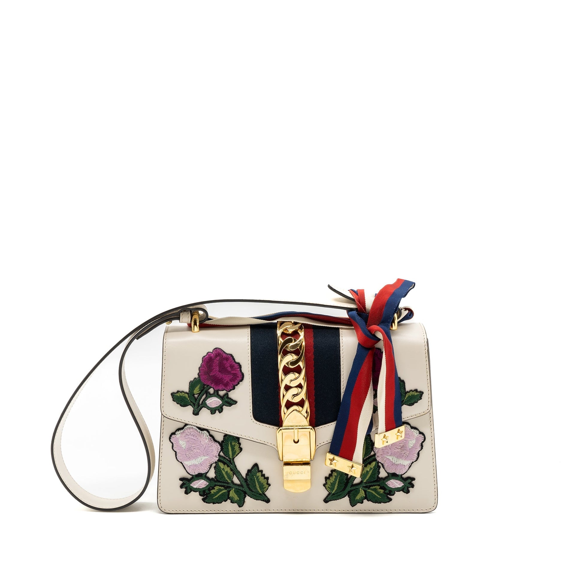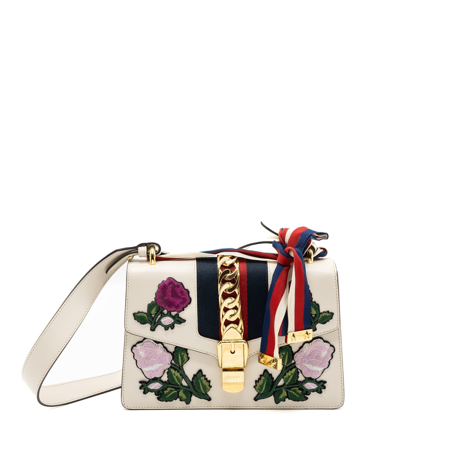 Gucci Sylvie Embroidered Shoulder Bag Calfskin White
